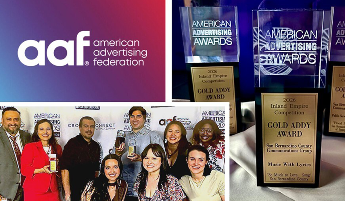 At the 2026 American Advertising Awards Inland Empire (the ADDYs), County Administrative Office Communications earned 12 awards: three gold and nine silver. The March 26 ceremony, held at the historic Terminal 1 at Ontario International Airport, recognizes the best in strategy, execution and storytelling in the local advertising industry.