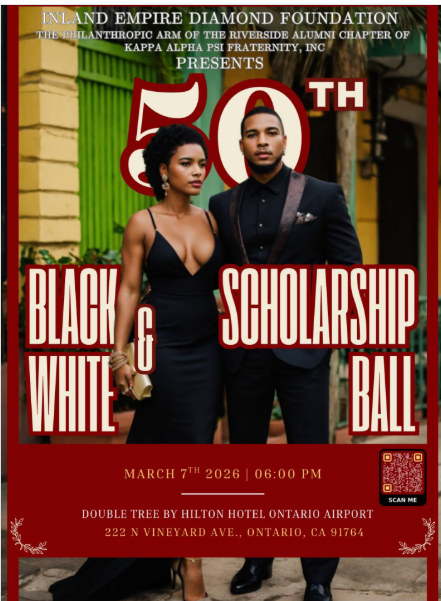 ONTARIO, CA—- The Inland Empire Diamond Foundation, the philanthropic arm of the Riverside Alumni Chapter of Kappa Alpha Psi Fraternity, Inc., proudly announces its 50th Annual Black & White Scholarship Ball, taking place on Saturday, March 7, 2026, at 6:00 p.m. at the DoubleTree by Hilton Hotel Ontario Airport, located at 222 N. Vineyard Avenue, Ontario, CA 91764.