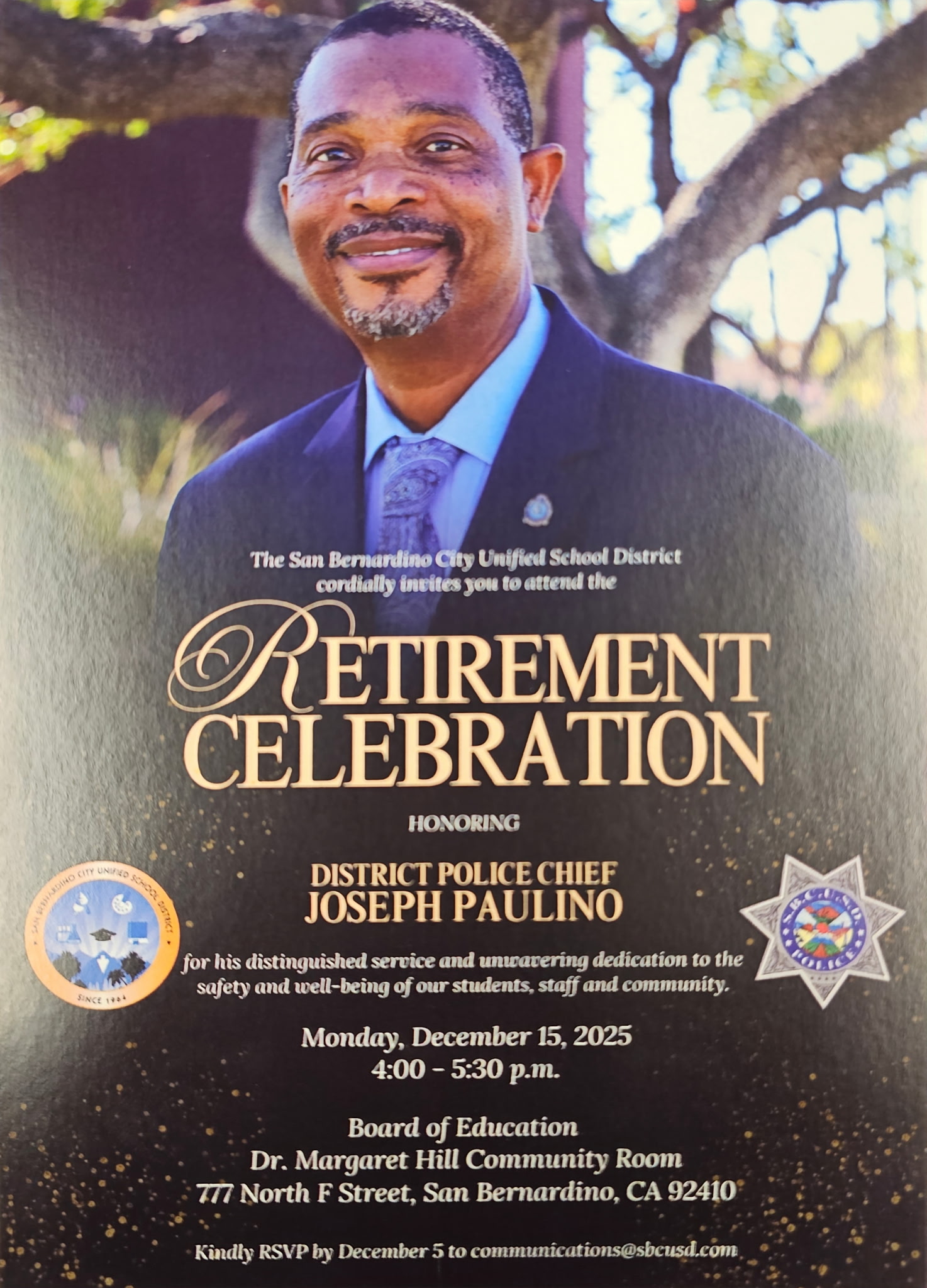 SAN BERNARDINO, CA — The San Bernardino City Unified School District (SBCUSD) will host a special retirement celebration honoring District Police Chief Joseph Paulino for his distinguished service and unwavering dedication to the safety and well-being of students, staff, and the broader community.