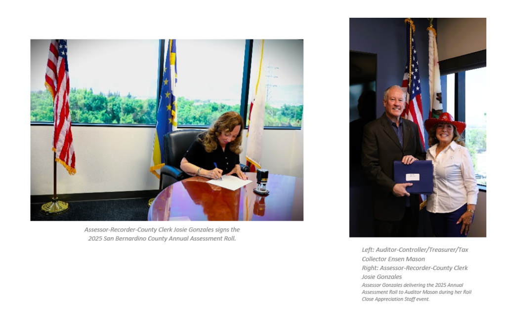 SAN BERNARDINO, CA– The 2025 San Bernardino County Assessment Roll, containing 903,602 parcels valued at $361,173,815,517, has been signed by Assessor-Recorder-County Clerk Josie Gonzales and personally delivered to Ensen Mason, San Bernardino County’s Auditor-Controller/Treasurer/Tax Collector.