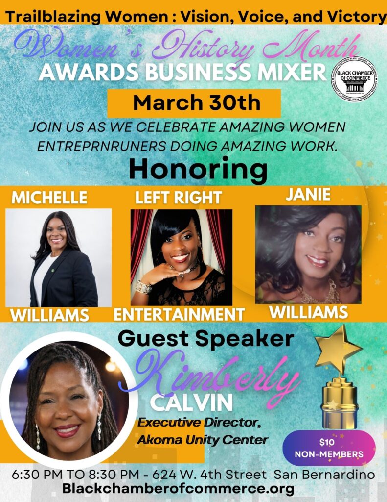SAN BERNARDINO, CA— The Southern California Black Chamber of Commerce – Inland Cities East Chapter will proudly honor outstanding women leaders during its Women’s History Month celebration, “Trailblazing Women of the Inland Empire: Vision, Voice, and Victory.” The event will take place Monday, March 30, 2026, at 6:30 PM at 624 W. 4th Street in San Bernardino.