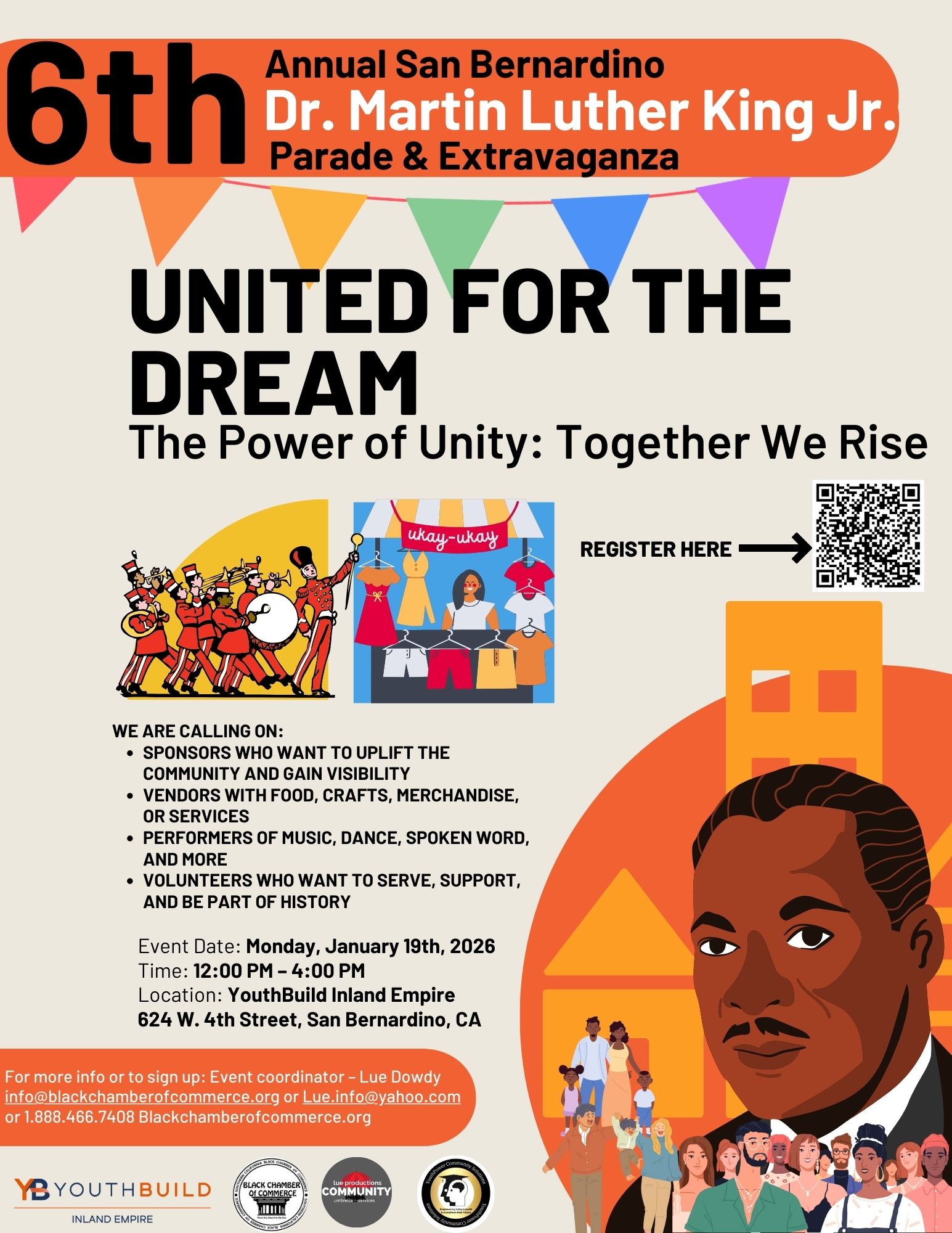 SAN BERNARDINO, CA — The Southern California Black Chamber of Commerce – Inland Cities East, YouthBuild Inland Empire, and LUE Productions Community Umbrella Services proudly announce the 6th Annual San Bernardino Dr. Martin Luther King Jr. Parade & Extravaganza, a powerful community celebration honoring the life, legacy, and enduring vision of Dr. Martin Luther King Jr.