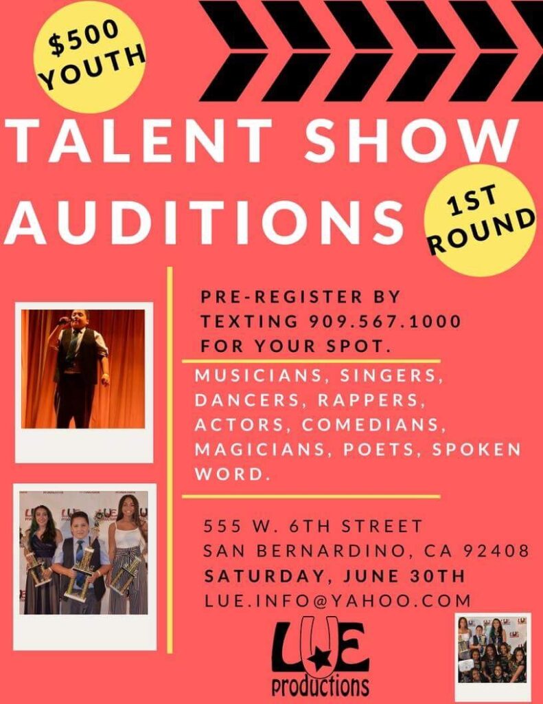 The following rules apply: Must reside in the Inland Empire, must be 19 years old or younger; and must audition. Auditions will be Saturday, June 30 from 1 p.m. to 4 p.m. at the Norman Feldheym Central Library located at 555 W 6thStreet in San Bernardino. If selected a $25 registration fee will be required. Let the community see your gift.